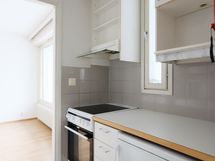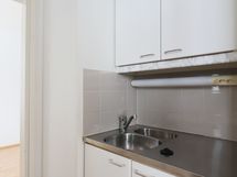 Ikkunallisessa keittokomerossa valkoiset kaapit metallivetimin. Työtaso osin rosteria ja osin laminaattia, välitila laattaa. Varusteluina jääkaappi, liesi, liesituuletin ja tilavaraus mikroaaltouunille.