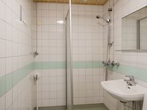 Pesuhuoneen seinät valkoista kaakelia vihertävällä tehosteraidalla. Lattia muovimattoa. Pesuhuoneessa suihku sekä suihkuseinäke, peili, pesuallas, bidee ja wc istuin. Pyykinpesukoneelle on hyvä tila ja liitäntä.