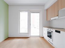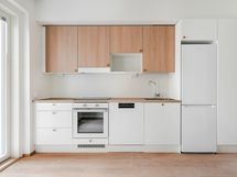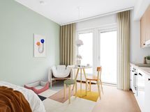 Tässä asunnossa on toimiva pohjaratkaisu, jonka ansiosta saat mahtumaan kotiisi kaiken tarvittavan. A-rapussa asunnon pintamateriaaleissa näkyy Klassinen-teema, jossa toistuvat pehmeät ja luonnonläheiset sävyt. Beige tehosteseinä luo kotiisi lämpimän tunnelman yhdessä vaalean tammen värisen vinyylilankun kanssa. B-rapun asunnoissa ilahduttavat Huoleton-teeman mukaiset värit. Pirteä vaaleanvihreä tai vaaleanpunainen tehosteseinä antaa persoonallisen säväyksen kotiisi ja on täydellinen pari lämpimän tammen värisen vinyylilankun kanssa.