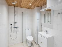 Kylpyhuoneesta löydät suihkunurkkauksen, peilikaapiston, allaskaapin ja paikan tilavarauksen pesutornille. Katon puupanelointi, spottivalaisimet ja lämpimät sävyt luovat rauhallisen tunnelman kylpyhuoneeseen. Kodissa on Oraksen hanat ja suihku.