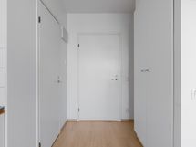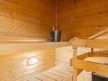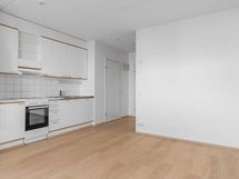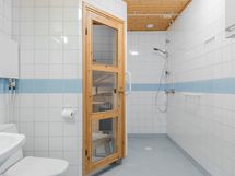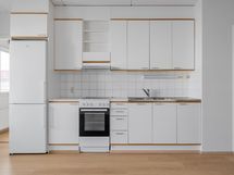 Keittotilassa on vaaleat kalusteet, jääkaappi ja helposti puhtaana pidettävä keraaminen liesi. Kaakeloidussa kylpyhuoneessa on liitäntä pyykinpesukoneelle.