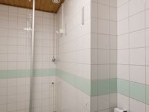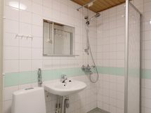 Pesuhuoneen lattia on muovimattoa, seinät laattaa ja katto paneelia. Pesuhuoneessa on suihku sekö suihkuseinä ja suihkuverhotanko, peili, valkoinen pesuallas sekä wc-istuin. Pesukoneelle on tila ja liitännät.