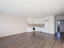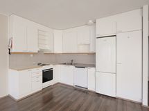 Olohuoneeseen auki olevassa keittiössä on valkoiset astianpesukone, liesi, liesituuletin sekä jääkaappipakastin. Valko-ovisissa kaapistoissa on metallivetimet, välitila on laattaa ja työtasot ovat laminaattia. Kaapistoissa tilavaraus mikroaaltouunille sekä.