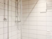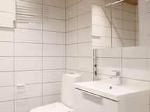 Pesuhuoneen lattia on tummanharmaata laattaa, seinät valkoista isoa vaakalaattaa ja katto tervaleppäpaneelia led-valaisimin. Valollinen peilikaappi, allaslaatikosto ja kirkaslasinen suihkuseinä kuuluvat tämän asunnon varustukseen. Pesukoneelle ja kuivausrummulle on tilavaraus ja liitännät.