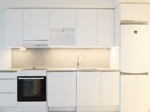 Keittotilassa on astianpesukone, induktioliesi kiertoilmauunilla, liesikupu, jääkaappipakastin ja tilavaraus mikroaaltouunille. Kaapistossa on valkoiset ovet alumiinisin listavetimin. Työtasot ja välitilalevyt ovat sementtikuvioista laminaattia. Välitilassa on led-nauhavalaisin huurrekuvulla.