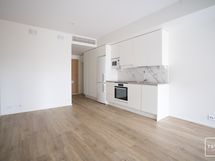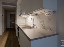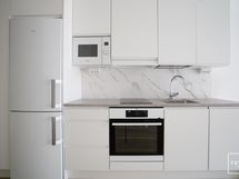 mm. laminaattitaso, keittiön kaapit sävyssä White Satin ja keittiön seinälaatta Bernini Statuario sävyssä Weber 11 white.