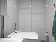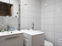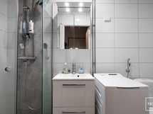 Pesutilojen varusteet: WC-istuin, suihku, suihkuseinä, pesukoneliitäntä, peilikaappi ja allaskaappi.