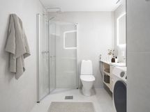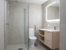 - Suihkuseinä, Suihku, Pesukonevalmius, Allaskaappi, Laattalattia, Laattaseinä, Lattialämmitys