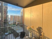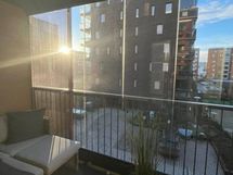 Suuret ikkunat sälekaihtimilla tuo valoa asuntoon. Iso lasitettu parveke, jossa terassimatto. Lisäksi alakerrassa tilava häkkivarasto.