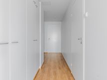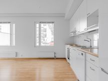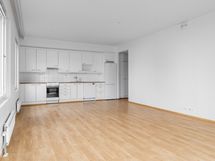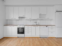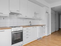 Keittotilan raikkaan valkoiset kalusteet ja kodinkoneet, kuten astianpesukone ja jääkaappi, tekevät arjesta sujuvaa. Kylpyhuone on laatoitettu vaaleanharmailla laatoilla, ja pyykinpesukoneellesi on liitännät ja tilavaraus.