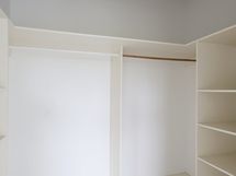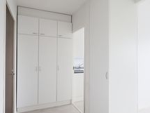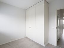 Toisen, isomman makuuhuoneen yhteydessä on tilava vaatehuone. Toisen makuuhuoneen kaapistojen lisäksi makuuhuonekäytävällä on lisää säilytystilaa.