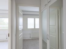Huoneistossa on kaksi selkeää makuuhuonetta ja näiden lisäksi on ns. olohuonetilaan on asennettu liukuovellinen vaatekaapisto kuvien ottamisen jälkeen. Näin myös tätä huonetta voi käyttää esimerkiksi vanhempien makuuhuoneena. Keittiön vieressä olevaa, eteiseen avointa tilaa voi taas käyttää ruokailutilana tai olohuoneena, sillä se on riittävän suuri molempiin käyttötarkoituksiin.