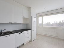 Keittiössä on astianpesukone, jääkaappipakastin, induktio keittolevy, erillisuuni kiertoilmatoiminnolla, liesituuletin ja tilavaraus mikroaaltouunille. Kaapit ovat valkoiset.