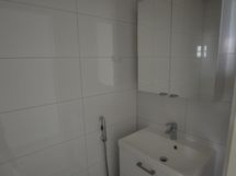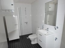 - Pesutilojen varusteet: Lattialämmitys ja pesukoneliitäntä. Pesutilojen kuvaus: Kauttaaltaan laatoitetut (lattialaatta tumman harmaa, seinät valkoista laattaa). Katto valkolakattua kuusipaneelia. Suihku, kääntyvä suihkuseinä, wc-istuin, bideesuihku, peili, allaskaluste vetolaatikoin, pyyhekoukut. Paikkavaraus pyykinpesukoneelle ja kuivausrummulle. Sähköinen mukavuuslattialämmitys. Erillisten WC:n lukumäärä: 1.