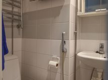 Pesutilojen varusteet: WC-istuin, suihku, peilikaappi ja pesuallas.