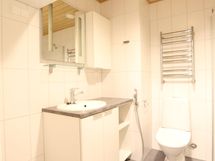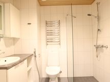 Laatoitettu kylpyhuone, jossa wc-istuin, suihku, suihkuseinä, peilikaappi, allaskaappi, pk-liitäntä, rättipatteri ja lattialämmitys