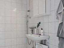 Pesutilojen varusteet: WC-istuin, suihku, pesukoneliitäntä, pesuallas ja bidee-suihku.