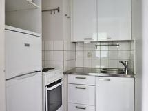 Keittiön varusteet: Jenkkikaappi, liesi, uuni ja mikroaaltouuni