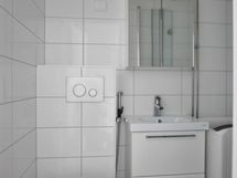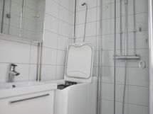 Pesutilojen varusteet: WC-istuin, suihku, pesukone, pesukoneliitäntä, peilikaappi ja allaskaappi.