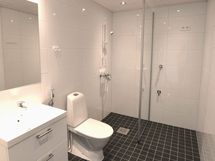 - Pesutilojen varusteet: Lattialämmitys ja pesukoneliitäntä. Pesutilojen kuvaus: Kauttaaltaan laatoitetut (lattialaatta tumman harmaa, seinät valkoista laattaa). Katto valkolakattua kuusipaneelia. Suihku, kääntyvä suihkuseinä, wc-istuin, bideesuihku, peili, allaskaluste vetolaatikoin, pyyhekoukut. Paikkavaraus pyykinpesukoneelle ja kuivausrummulle. Sähköinen mukavuuslattialämmitys.
