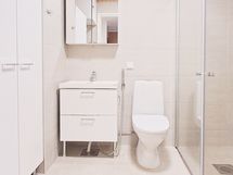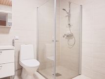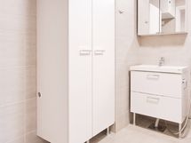 - Varusteet: WC, suihku, suihkukaappi, pesukoneliitäntä, kylpyhuonekaapistot, allaskaappi, peilikaappi, lattialämmitys