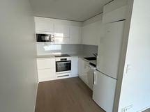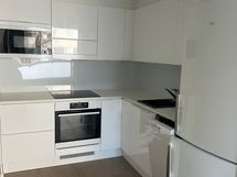 - Induktioliesi, erillisuuni, vedettävä liesikupu, jääkaappipakastin, astianpesukone AEG, mikroaaltouuni. Vaaleat kaapistot. Kodinkoneet valkoiset. Työtaso vaalea, komposiittiallas (tumma). Välitila lasia (vaalea), välitilan valaistus led-spotit.
