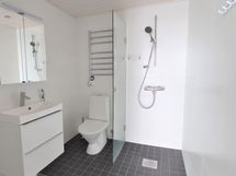 - Pesutilojen kuvaus: Kauttaaltaan laatoitetut (lattialaatta tumman harmaa, seinät valkoista laattaa). Katto valkolakattua kuusipaneelia. Suihku, kääntyvä suihkuseinä, wc-istuin, bideesuihku, peilikaappi, käsienpesuallas, allaskaappi, pyyhekoukusto. Paikkavaraus pyykinpesukoneelle ja kuivausrummulle.
