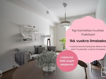 Kampanjaehdot: Kampanja voimassa Juli Pukkilan Elegance asuntoihin, joihin solmitaan toistaiseksi voimassa oleva vuokrasopimus 12 kuukauden minimiasumisajalla. Jotta voit hyödyntää kampanjamme, asunnon vuokraus on tehtävä verkkosivuillamme 1.4.-30.4.2026 välisenä aikana. Vuokrauksen yhteydessä maksettu ennakkovuokra vähennetään kolmannelta täyden kuun vuokralaskulta ja kampanjaetu vähennetään neljänneltä täyden kuun vuokralaskulta. Mikäli sopimus on kestänyt alle 4 kuukautta, kampanjaetua ei hyödynnetä eikä sitä hyvitetä vuokralaskulta. Mikäli sopimus irtisanotaan ennen minimiasumisajan päättymistä, aiemmin hyvitetty kampanjaetu laskutetaan viimeisessä vuokralaskussa. Kampanjaetua ei voi hyödyntää aiemmin tehtyihin vuokrasopimuksiin eikä etua voi yhdistää muihin kampanjoihin. Kampanjaetua ei voi hyödyntää sopimusmuutoksissa, asunnonvaihdoissa Juli-kodista toiseen minimiasumisaikana tai jos vuokranmaksu ei ole ajan tasalla. Kampanjaetu ei koske vesimaksua.