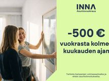-500 € vuokrasta 3kk ajan. Edellyttää 12kk sitoutumista asuntoon. Edun saa uusiin vuokrasopimuksiin, jotka alkavat viimeistään 1.5.2026. Vakuus 350 eur.