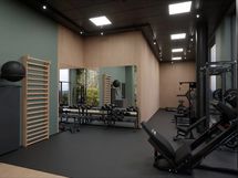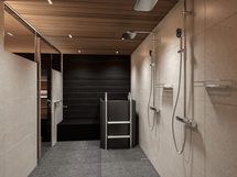 Kuntosali, saunaosasto kylmäaltaalla, olohuone, parkkihalli, viihtyisä sisäpiha