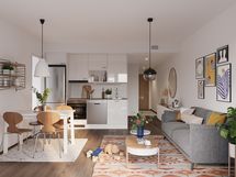 - Keittiö ja olohuone muodostavat yhtenäisen oleskelutilan