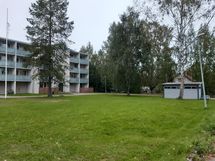 Ikkuna näkymänä vehreä puusto, jonka takana Jokelan isot nurmi-ja jalkapallokentät.