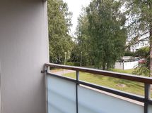 Etelä parveke avautuu olohuoneesta ja taloyhtiön iso nurmipiha luo vehreän ympäristön omakotitaloalueen reunasta.