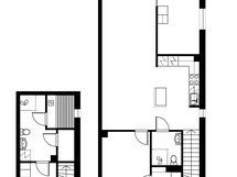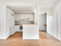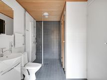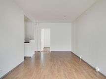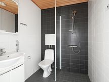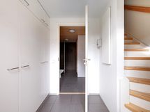 Tässä asunnossa ovesta tullaan sisään alakerrasta, jossa on eteisen lisäksi tilavat kylpyhuone- ja saunatilat sekä portaiden alustilaan tehty pieni varastohuone. Alakerran kylpyhuoneessa on myös liitännät ja tilavaraus pesukoneelle.