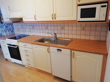 Säilytystilaa on reilusti. Keittiössä astianpesukone, keraaminen liesi, mikro ja jääkaappipakastin. Tilaa isolle ruokapöydälle.