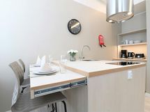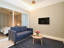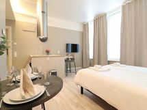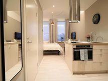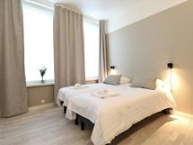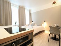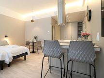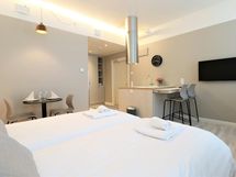 In this cozy studio you’ll find a convenient kitchenette that is equipped with a small stovetop, refrigerator, dishwasher, a combination microwave/convection oven, coffee machine, water kettle and tableware. For comfort, there is a stylish private bathroom and shower as well as a hairdryer. Relaxing nights are provided for by two single beds. There is a complimentary Wi-Fi connection as well as bed linen and towels.