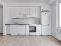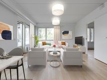 Tässä 1. kerroksen kodissa on skandinaavisen vaaleat materiaalit ja toimiva pohjaratkaisu. Avokeittiö ja olohuone muodostavat viihtyisän kokonaisuuden, makuuhuoneessa on hyvin säilytystilaa ja kylpyhuoneessa on tilavaraus pesukoneelle. Kodin kruunaa lasitettu parveke.