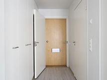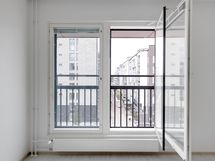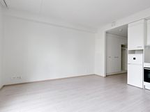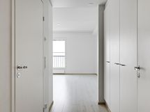 Asunnossa on ranskalainen parveke, joka tuo runsaasti valoa sisään ja avartaa tilaa. Vaalea laminaattilattia luo raikkaan ja modernin ilmeen, ja eteisessä on hyvin kaappitilaa säilytystarpeisiin.