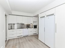 Kodin ajattomat pintamateriaalit luovat neutraalin pohjan persoonalliselle tyylillesi. Lattiat ovat vaalean tammensävyistä laminaattia ja seinät on maalattu vaaleiksi. Ikkunoissa on valkoiset sälekaihtimet. Tasokkaassa keittiössä on valkoiset kaapistot ja metallinväriset vetimet. Ylä- ja alakaappien välinen tila on vaaleaa laminaattia tai rosteria, tasot harmaata laminaattia tai rosteria. Täysvarustellussa keittiössä on induktiotaso, kalusteuuni, liesikupu, astianpesukone ja jääkaappipakastin. Mikroaaltouunillekin on tilavaraus. Tässä keittiössä on ilo kokkailla!