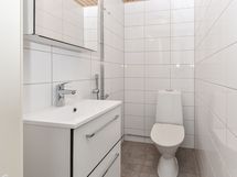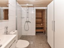 Arjen varma piristys on uutuuttaan hohtava kotikylpylä, jonka seinät ovat valkoista ja lattia harmaata laattaa. Tehopohjaisessa kylpyhuoneessa on tilaa myös pyykkikoneellesi. Pyykkien lajittelu ja säilytys hoituu näppärästi pyykkikaapin ansiosta.