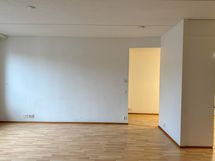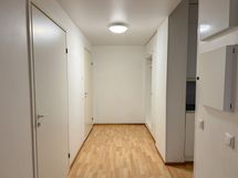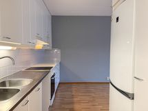 Asunnossa on vaaleat laminaattilattiat ja maalatut seinät. Kylpyhuoneessa on vaalea beigen sävyinen muovimatto ja valkoiset/vaalean beiget laattaseinät sekä hyvin tilaa pyykinpesukoneelle. Tilavassa keittiössä on valkoiset kaapistot ja liitännät astianpesukoneelle.