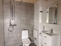 Kylpyhuoneen lattiassa on tyylikäs, tummanharmaa laatta ja seinissä valkoinen, sekä yhdellä seinällä tehosteena lattian sävyyn sopiva harmaa laatta. Kylpyhuoneeseen on mahdollista asentaa oma pesukone. Ikkunoissa on sälekaihtimet.
