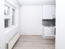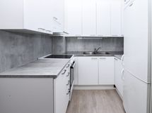 Näppärässä keittiössä on keraaminen liesi ja jääkaappi-pakastin. Vaaleat pinnat antavat mahdollisuuden sisustaa kodin juuri oman maun mukaan.