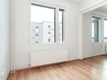 Asunnon seinäpinnat ovat valkoiset ja lattiassa on laminaatti.