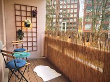 - Parveke, jossa uusi komposiittilattia sekä ruokoaita tuomaan tunnelmaa