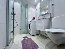 - Suihku, Suihkuseinä, Pesukone, Peilikaappi, Halogeenivalot, Rättipatteri, Laattaseinä, Laattalattia, Lattialämmitys