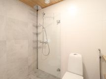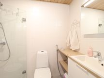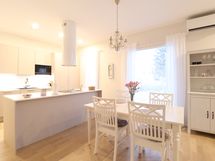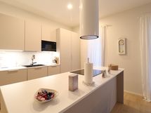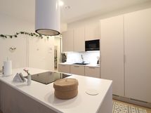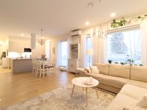 Asunnon keittiö on moderni josta löytyy paljon säilytys tilaa. Keittiössä on uuni/liesi, mikroaaltouuni, jääkaappi/pakastin. Isot ikkunat mitkä venyy olohuoneesta keittiöön saakka tuovat paljon avaruutta sekä valoa asuntoon. Makuuhuoneet ovat hyvän kokoisia, paljolla kaappitilalla. Kylpyhuoneessa valmiiksi pesukone sekä ihana sauna.