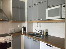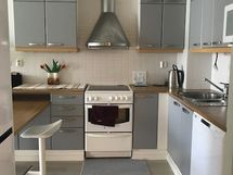 Halogeenivalot, Paljon kaappitilaa, Puutasot, Astianpesukone, Keraaminen liesi, Jääkaappi, Pakastin