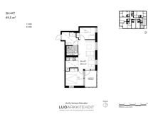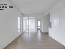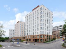 The building is an eight floor single-elevator residential building with 50 apartments. The light-colored apartments feature high-quality surface materials and appliance solutions. The kitchen is equipped with an integrated dishwasher, built-in oven, induction cooktop, and fridge-freezer combination. The tiled bathroom includes electric underfloor heating and space for a washing machine.
