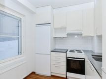 Mukavan kokoisessa keittokomerossa kaikki kokkailuun tarvittava on käden ulottuvilla. Kaakeloidussa kylpyhuoneessa on tilavaraus pesukoneelle.